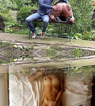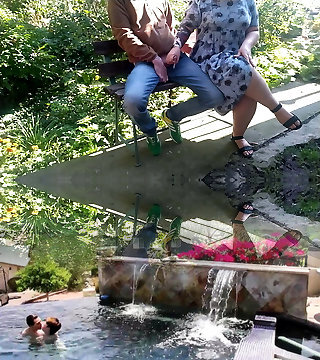 Wild mother-in-law licks cum from fingers after handjob to son-in-law outdoors