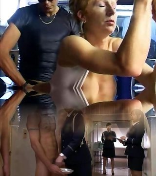 Brutal manager fucks his Four eyed brunette waitresses at the table after work