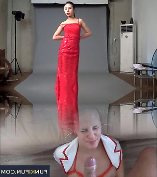 Helen Star busty babe in latex dress and highheels slapping her humungous tits and ass