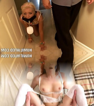 Pretty lesbian romp slave with a hairy cunt being tortured and dildo fucked