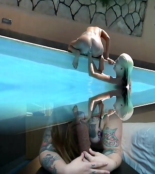 Torrid blonde Latina takes a black dick in all slots poolside