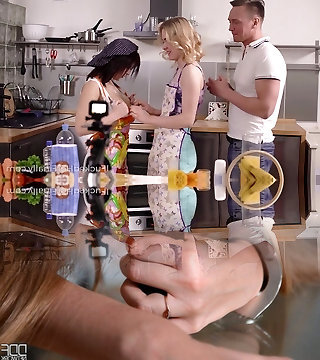 Two cooking girls in aprons gulp a big dick covered in whipped mayo and get fucked