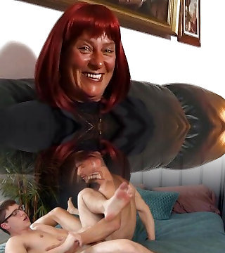 Lewd red haired MILFie housewife teases her own saggy udders in weird way